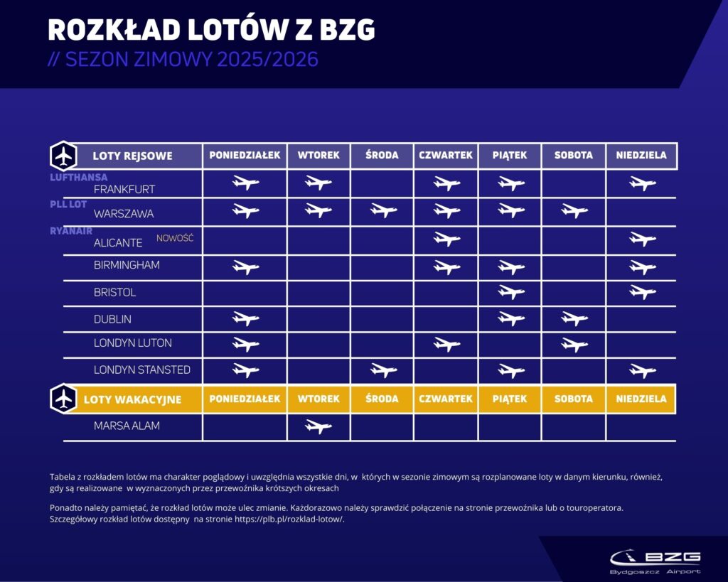 Warszawa – Bydgoszcz – przylot: 23:45 (w środy dodatkowo 14:30), odlot: 5:40 (w środy dodatkowo 15:05)